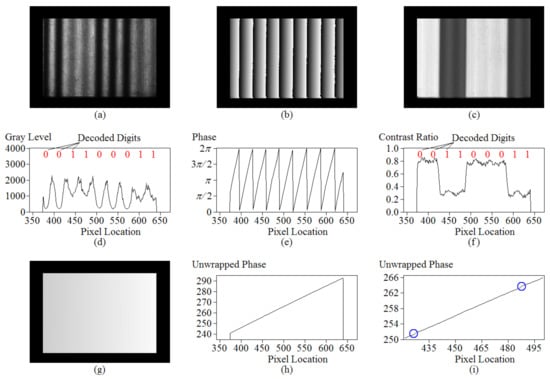 The local maxima illustrated in Figure 9d were higher than the gray level of 1130. As described in Section 2.2, it can be categorized into the case of high-reflectance surfaces. Consequently, both Equations (11) and (12) could be used to decode fringes. Figure 9d shows a stream of binary digits that were computed using Equation (11). The binary stream listed in Figure 9f is obtained by Equation (12). Both the decoded streams could be employed to identify the fringe orders. Using the look-up table shown in Figure 2a, they were found to range from 40 to 48. The unwrapped phase map was then carried out using Equation (14). Figure 9g shows the unwrapped phase map. Its 1D distribution along an image row is illustrated in Figure 9h.