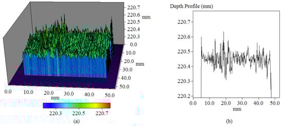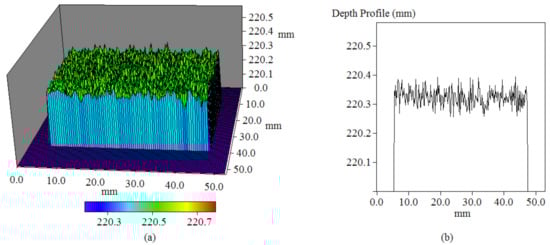 Fortunately, such fluctuations could be calibrated. An example is illustrated in Figure 7a, which shows the correspondence between the fluctuated phase and the depth position. Using Equations (15)–(17), the profile of the standard gauge block was retrieved. Figure 10a shows the retrieved profile. Its 1D distribution along the x-axis is shown in Figure 10b. In the low contrast area, the amplitude of the projected fringes was reduced, producing more errors in the retrieved profile. In our measurement system, the depth accuracy at the low contrast area was approximately 300 µm, and that at the high contrast area was approximately 100 µm. The depth accuracy was evaluated as the difference between the local maximum and the local minimum of the depth profile.