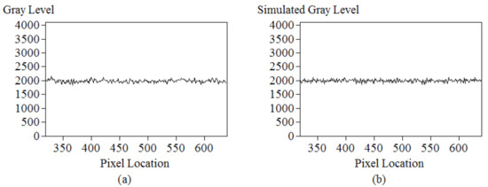 It was shown that the standard deviation of the extracted phase values, σφ, is inversely proportional to the fringe contrast [30,31]. However, as shown in Equation (3), both the fringe contrast Cm and the DC gray level Am are quantized into two levels. Such changes might cause σφ to be not inversely proportional to Cm. To evaluate the change in systematic accuracy caused by modulating Cm and Am, a comparative simulation was performed. Figure 13a shows the observed 1D distribution Id when illuminating a screen with an input gray level Ip = 120. The average of the observed gray levels Id was 1992.1, and the standard deviation of the white noise was 50.198. The corresponding signal-to-noise ratio (SNR) was approximately 40 (i.e., 1992.1/50.198 ≈ 40). Based on this, a white noise generator with SNR = 40 was produced using the software MATLAB. Figure 13b shows the simulated distribution.