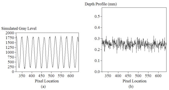 The five single-frequency patterns whose distributions are shown in Figure 11a were used to evaluate the simulation precision. With reference to Equation (2), their corresponding DC bias and fringe contrast were Am = 125 and Cm = 0.8, respectively. A set of five patterns Id(k) was carried out using Equation (4). Figure 14a shows the simulated result to represent the first observed projection Id(1) by adding white noises with SNR = 40. With Equation (8), the phase of the simulation was extracted. Unwrapping was performed using Goldstein’s method. In the experiment using the combination of binary-coding and phase-shifting projections, the coefficients in Equation (15) were calculated. Hence, the profile could be retrieved from the simulated projections. Figure 14b shows the retrieved profile along one image row. The depth profile’s standard deviation was σz = 29.6 µm. The difference between the local maximum and the local minimum was approximately 100 µm, which was similar to the real case.