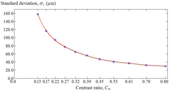 The simulation was performed for another set of five single-frequency patterns. The maximum gray level of the input patterns was 225, but the minimum was increased to 40. Hence, the corresponding DC gray level and contrast ratio were Am = 132.5 and Cm = 0.698, respectively. The computed standard deviation of the depth profile was σz = 32.3 µm.These kinds of simulations were repeated for sinusoidal patterns with various fringe amplitudes, wherein all the maximum gray levels were 225, but the minimum gray levels were sequentially changed into various values: 55, 70, 85, …, 145, 160, and 175. A list of the standard deviations σz for various fringe amplitudes Bm and corresponding DC gray levels Am is depicted in Table 1. The corresponding minimum gray levels, contrast ratios, and products of σz and Cm are listed as well. The product of σz and Cm was not constant, indicating that σφ or σz was not inversely proportional to Cm. The reason was that the DC gray levels changed with the contrast ratios. Data points with a fitted relationship between σz and Cm are shown in Figure 15.