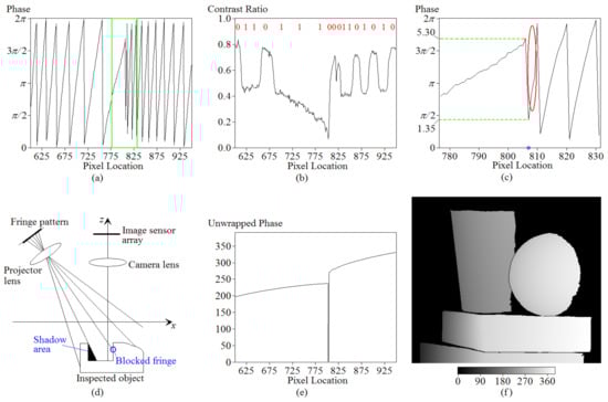 (a) The phase distribution along the image row that is marked with a green frame in Figure 16b. (b) The corresponding contrast distribution. (c) A close-up view of the green frame that is marked in (a). (d) A configuration illustrating obstructions and shadows caused by tilted projections. (e) The unwrapped phase distribution along the sampled image row. (f) The entire unwrapped phase map.