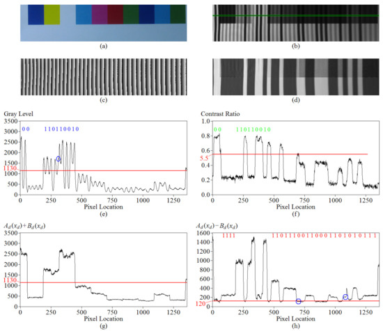 A piece of paper that was textured with various colors, as shown in Figure 19a, was chosen as the inspected sample. Figure 19b shows an image that was recorded using the 12-bit CCD camera for the first pattern projection on this surface. The phase and contrast maps that were extracted by the phase-shifting algorithm are illustrated in Figure 19c,d, respectively. Along the image row marked with a green frame that is shown in Figure 19b, the gray-level distribution and contrast distribution are shown in Figure 19e,f, respectively.