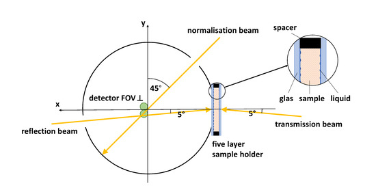 In following, we therefore used only fresh samples obtained from the slaughterhouse (Ulmer Fleisch GmbH, Ulm, Germany), prepared and measured within eight hours postmortem. For organizational reasons of the time consuming preparation process of our samples, a small portion of samples were also stored in the fridge, at 4 °C, for a maximum of two days before measurement. The measurements themselves were performed within two minutes at room temperature, after sample preparation and temperature adjustment. We decided to use the cuvettes mentioned by Bergmann et al. [15] using known N-BK7 glass slides (“34–427”, Edmund Optics, Barrington, NJ, USA) for the measurements, to avoid dehydration, blood loss, surface roughness effects as well as to decrease the influence of the lacking knowledge of the correct refractive indices of the studied tissues. Therefore, we filled liquid with a known refractive index in the space between glass slide and sample surface. This results in a five layered construct surrounded by air, see Figure 1.