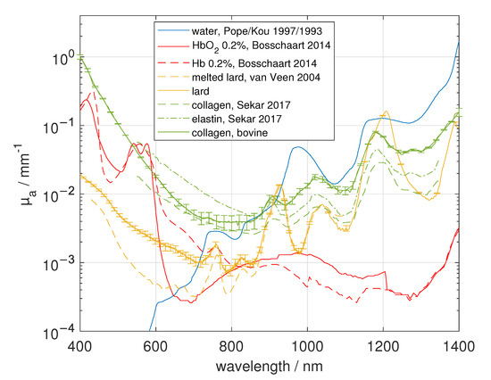 The absorption coefficients of pure water and blood from pig were also measured in this study (not shown), resulting in very similar results compared to [22,23,24]. We note that we did not differ the spectra of oxygenated and de-oxygenated blood from that of oxygenated and de-oxygenated myoglobin.