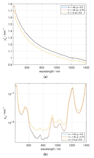 To demonstrate the influence of the applied asymmetry factor and refractive index, we used one sample of adipose tissue (three layered construct) from the back of the pig, having a sample thickness of 3.5 mm and varied g as well as n in the Monte Carlo simulations for fitting the experimental data, see Figure 3. As it was stated by Foschum et al. [14], the impact on the determined optical properties of n is larger compared to the asymmetry value g. For example, at 544 nm we obtained a = 1.429 mm ( = 544 nm) ≈ 5) and = 0.032 mm for the presumed correct optical properties of g = 0.9 and n = 1.46. A change in g to 0.75 causes a deviation of 0.24% in and 0.54% in , whereas a change in n to 1.4 results in a deviation of 4.76% in and 14.82% in .