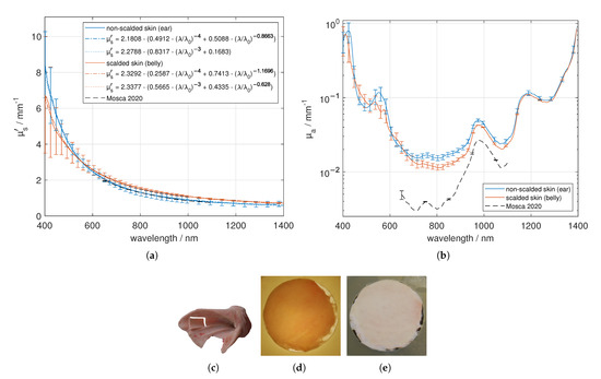 Effective scattering coefficient (a) and absorption coefficient (b) versus wavelength for skin. Exemplary tissue sample (c), a 1.46 mm thick sample in transmission (d) and in reflection (e) under diffuse illumination.