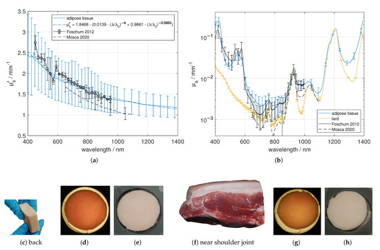 The investigated adipose tissues were obtained near the shoulder joint and from the back regions of five pigs. As can be seen in Figure 5c,f, there is a visible intersection within the adipose tissue, and therefore we differentiated between the layer faced to the skin and the layer faced to the muscle. Apart from this, the adipose samples seemed to be fairly homogeneous. We found out that fatty tissue near the skin boundary has a smaller effective scattering coefficient compared to tissue near the muscle boundary (data not shown). Furthermore, adipose tissue near the shoulder joint had a significantly larger than that from the back (data not shown). The standard deviation of for a single adipose tissue sample is comparable to the standard deviation from non-scalded skin, compare Section 3.1. In contrast, comparing all measurements of the adipose tissue near the skin and muscle boundary as well as from the shoulder joint and from the back, we obtain a larger standard deviation Figure 5a. Compared to the data presented by Mosca [7] and Foschum [13], we got similar results for and . In the NIR absorption range the main absorber is fat (in the figure labeled as lard).