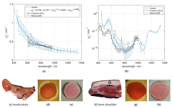 Effective scattering coefficient (a) and absorption coefficient (b) versus wavelength for muscle. Exemplary tissue samples (c,f) including region of interest, a 3.53 mm (masticatory muscle) and a 1.86 mm (shoulder) thick sample in transmission (d,g) and in reflection (e,h) under diffuse illumination.