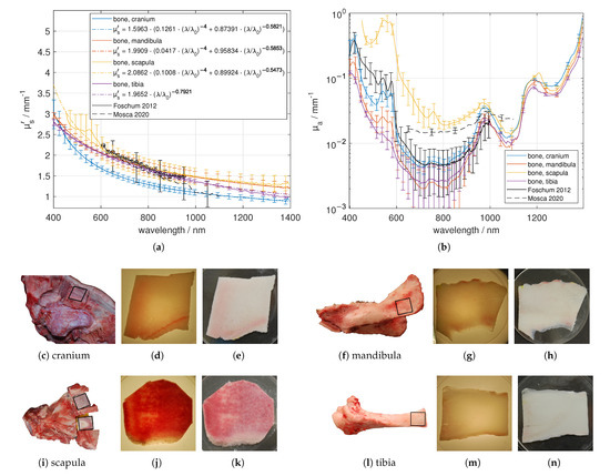 Effective scattering coefficient (a) and absorption coefficient (b) versus wavelength for bone. Exemplary tissue samples (c,f,i,l) including region of interest, a 1.05 mm (cranium), a 0.93 mm (mandibula), a 1.33 mm (scapula) and a 0.91 mm (tibia) thick sample in transmission (d,g,j,m) and in reflection (e,h,k,n) under diffuse illumination.