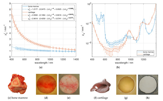 Effective scattering coefficient (a) and absorption coefficient (b) versus wavelength for bone marrow and cartilage. Exemplary tissue samples (c,f), a 2.54 mm (bone marrow) and a 1.12 mm (elastic cartilage) thick sample in transmission (d,g) and in reflection (e,h) under diffuse illumination.