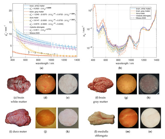 Besides applying an appropriate experimental setup, also the sample preparation and the measurement procedure are important for a precise determination of the optical properties of tissue. Due to the given measurement apparatus, we are limited to studies that are affected by alterations of the investigated tissue. The tissue preparation may change, e.g., the water content, the oxygenation state and the amount of blood within the tissue [20,21], and therefore the optical properties. Besides this, also freezing-thawing cycles of biological tissues have an influence on the determined optical properties due to cell membrane disruption and liquid loss [7]. Our investigations on gray brain matter of a pig, not shown here, pointed out a relative decrease of around 25% in and a relative decrease of 5% in at around 550 nm (blood loss) after storing the prepared sample at—14 °C for 15 days.
