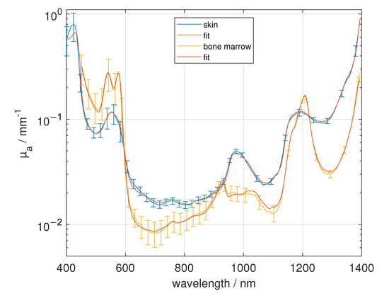Comparison of the absorption spectra from 400 nm to 1400 nm of skin and bone marrow with the fitted concentrations of water, fat, collagen, de-oxygenated blood and oxygenated blood and a constant offset factor.