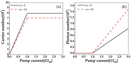 We calculate the carrier number and photon number for an increasing bias current, as shown in Figure 2a,b, respectively. It is found that the number of stages m has little effect on the carrier number (in Figure 2a) but that it influences the photon number (in Figure 2b). For relatively large numbers of stages such as m = 10 (red dashed curve), the output power is much higher than in the case of m = 5 (black solid curve), as shown in Figure 2b.
