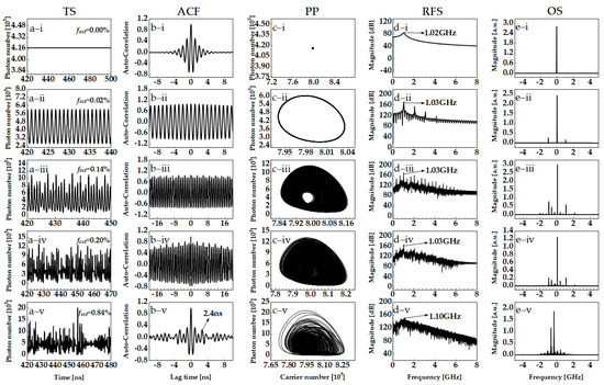 Output of ICL with external optical feedback as feedback strength increases with m = 5, I = 1.1Ith, and τf = 2.4 ns; from the top down, i: fext = 0.0%, ii: fext = 0.02%, iii: fext = 0.14%, iv: fext = 0.20%, v: fext = 0.84%; columns (a–e) are time series (TS), autocorrelation curve functions (ACF), phase portrait (PP), radio-frequency spectrum (RFS) and optical spectra (OS), respectively.