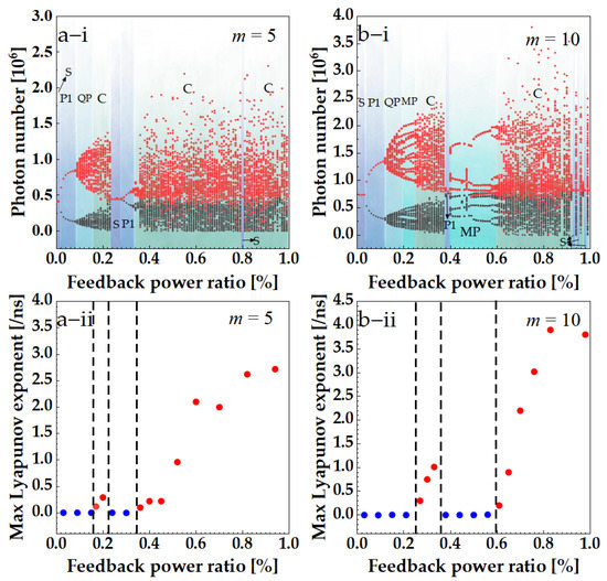 By using bifurcation diagrams, the dynamics of the ICL for increasing feedback strength can be obtained, as shown in Figure 4(a-i) with m = 5 and Figure 4(b-i) with m = 10. Maximum Lyapunov exponents [33,34] can be used to determine whether the ICL output with external optical feedback is chaotic (red dots) or not (blue dots), as shown in Figure 4(a-ii,b-ii). As shown in Figure 4(a-i), the route to chaos for a 10-stage ICL with external optical feedback is from stable (S) to period-1 (P1), then quasi-periodic (QP) and then chaos (C). This route is different from that of a 10-stage ICL where multiple-periodic (MP) oscillations are observed. The number of stages m has an effect on the photon number and phase, as presented in Equations (2) and (3), which results in different routes to chaos.