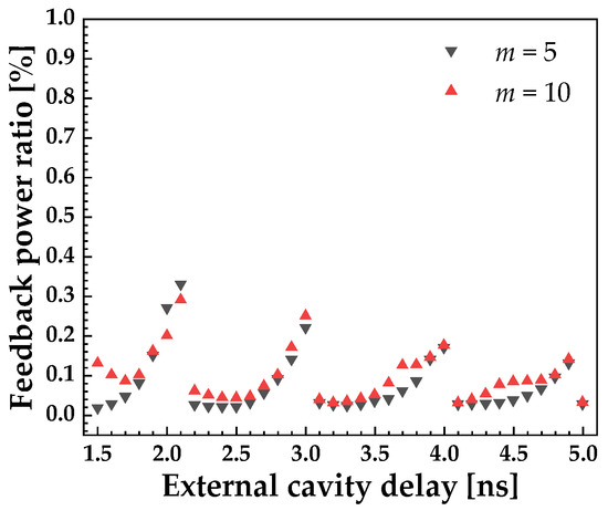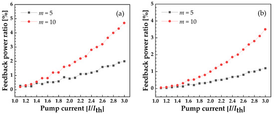 To illustrate the pump current effects, the dependence of the Hopf bifurcation point on bias current is investigated. In Figure 6a,b, two external cavity delays are compared, viz τf = 2.0 ns and τf = 2.4 ns. As the pump current increases, the Hopf bifurcation point gradually increases for both m = 5 (squares) and m = 10 (circles) cases, as well as for τf = 2.0 ns and τf = 2.4 ns. Compared with τf = 2.4 ns, at τf = 2.0 ns there is a need for a larger feedback power ratio to enable the ICL to enter an unstable state, which is around 1.3 times that of τf = 2.4 ns for a pump current of 3Ith. Since these two delays show similar trends for the Hopf bifurcation point versus bias current, we focus our attention on τf = 2.4 ns in the following results.