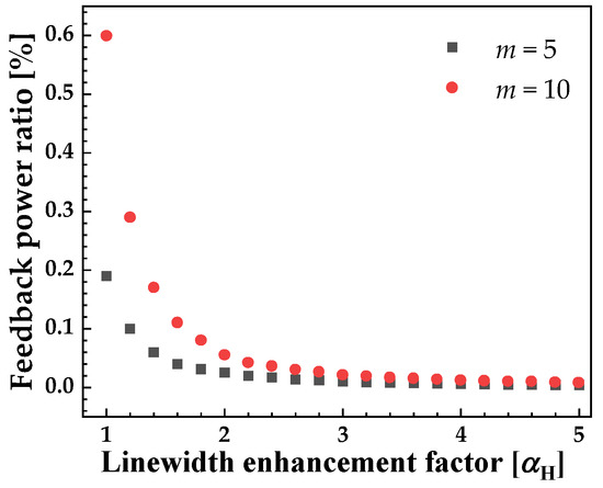 It is well-appreciated that the linewidth enhancement factor, αH, plays a crucial role in semiconductor laser nonlinear dynamics. For common quantum well laser diodes, αH is in the range of 2.0 to 5.0 [35,36]. A recent report shows that the below-threshold linewidth enhancement factor of ICL is in the range of 1.1–1.4 [14]. Here, we calculate the Hopf bifurcation point versus linewidth enhancement factor, which ranges from 1 to 5, as shown in Figure 7. As the linewidth enhancement factor increases from 1 to 2, the Hopf bifurcation point value reduces rapidly and then tends to be stable as αH increases further. Thus, as expected, a small αH imparts the ICL with considerable dynamic stability.