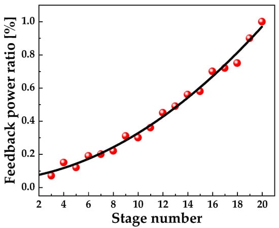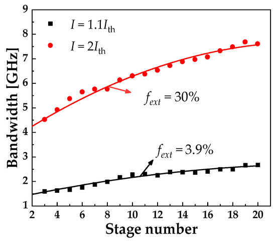 The stage number effect is presented in Figure 12, where m ranges from 3 to 20 and the pump currents are 1.1Ith (black squares) and 2Ith (red circles). Although the increase in bandwidth for the relatively high pump current, 2Ith, is faster than that of the relatively low pump current, 1.1Ith, the tendency of the stage number effects is the same, that is the bandwidth of chaos increases as the stage number increases. This tendency is verified in Figure 9, Figure 10 and Figure 11.