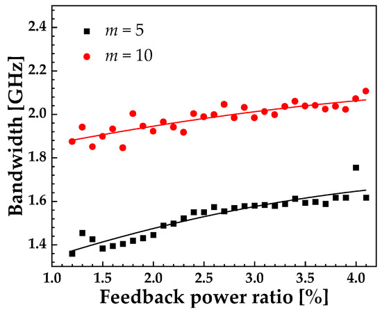 Bandwidth of chaos vs. feedback power ratio under I = 1.1Ith, τf = 2.4 ns, m = 5 (black squares) and m = 10 (red circles).
