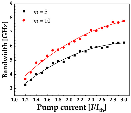Bandwidth of chaos vs. bias current when fext = 28% and τf = 2.4 ns with m = 5 (black squares), m = 10 (red circles).