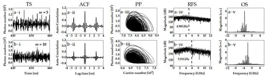 Figure 11 respectively presents the time series, auto-correlation, phase diagram, RF spectrum and optical spectral of mid-infrared chaos for m = 5 (in Figure 11a) and m = 10 (in Figure 11b). This indicates that for relatively high number of stages the bandwidth of chaos from ICLs is further enhanced, as shown in Figure 11(a-iv,b-iv). The enhanced bandwidth of the chaos is due to the relaxation oscillation frequency of the ICL increasing with the number of stages.