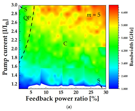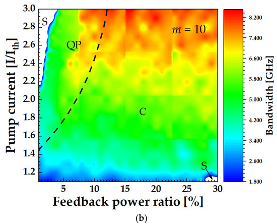By using Maximum Lyapunov exponents, we distinguish chaos from QP, and calculate the 80% energy power bandwidth versus feedback power ratio and pump current, as shown in Figure 13. By using dashed curves, we distinguish QP and C, while the white region represents the stable(S) output. It is found, in Figure 13a, that S is observed for a small number of stages m = 5 when the bias current is below 1.2Ith and the feedback power ratio is in the range of 4% to 30%. Stable output is also found in the top left corner of Figure 13a. For a large stage number, that is m = 10, S is observed when the pump current is small, below 1.2Ith, and the feedback power ratio is around 28%, as indicated in the bottom right corner of Figure 13b. S is also observed for m = 10 when the bias current is higher than 2.16Ith and the feedback power ratio is less than 4%, as seen in Figure 13b. These results indicate that an ICL with a relatively high bias current will exhibit S, QP and then enter into C as the feedback power ratio increases. As the stage number increases from 5 to 10 and the ICL is subject to a relatively high bias current, both S and QP regions are extended, as shown towards the left of Figure 13a,b. This confirms that for relatively few stage numbers an ICL with external optical feedback is amenable to exhibiting chaos. The results for both cases confirm that in order to obtain broadband mid-infrared chaos, one needs a relatively high pump current as well as a large feedback power ratio. Furthermore, a 8 GHz bandwidth of mid-infrared chaos can be obtained for m = 10, as shown in the top right corner of Figure 13b.