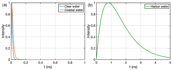 The normalized impulse response in (a) clear, (a) coastal and (b) harbor water using double-gamma functions.