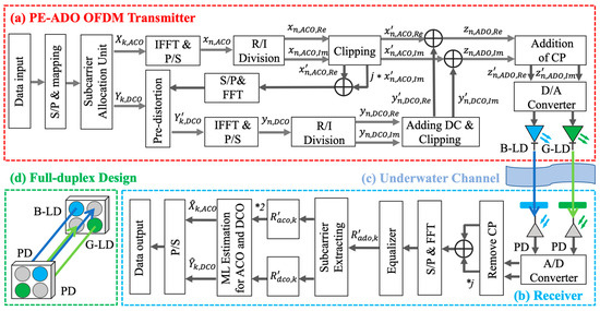 On the other hand, orthogonal frequency division multiplexing (OFDM) is widely used in OWC due to its strong capability to resist inter-symbol interference (ISI). However, the transmitted signals in an OWC system should be non-negative and real-valued due to the intensity modulation and direct detection while the conventional OFDM signals are bipolar complex-valued, which requires the modification of conventional OFDM. Therefore, Hermitian symmetry is commonly utilized before the inverse fast Fourier transform (IFFT) to satisfy the real-valued property. To obtain non-negative signals, various optical OFDM schemes are applied. Direct current biased optical OFDM (DCO-OFDM) adds a DC bias [9], and asymmetrically clipped optical OFDM (ACO-OFDM) utilizes the odd-subcarrier modulation and zero clipping [10]. However, DCO-OFDM and ACO-OFDM suffer from the problems of low power efficiency and low spectral efficiency, respectively. Asymmetrically clipped DC-biased optical OFDM (ADO-OFDM) is the performance tradeoff between DCO-OFDM and ACO-OFDM considering power and spectral efficiency [11,12,13]. In a conventional ADO-OFDM scheme, the transmitted signals are generated by superimposing the ACO-OFDM signals and DCO-OFDM signals. The zero clipping of the ACO-OFDM branch will introduce clipping noise into the even subcarriers in the transmission of DCO-OFDM signals, bringing difficulties to the demodulation of the DCO-OFDM signals. At the receiver, the ACO-OFDM signals must be demodulated first and subtracted from the reconstructed ADO-OFDM signals, and then the DCO-OFDM signals can be demodulated correctly, which results in high-complexity, delay and error propagation issues in demodulation [14]. The pre-distorted enhanced (PE) operation is applied in PEADO-OFDM to decrease the mutual interference and alleviate the issues caused by the clipping noise of the ACO-OFDM branch [15]. PEADO-OFDM eliminates the inter-carrier interference (ICI) between the ACO-OFDM and the DCO-OFDM branches at the transmitter and is applied as the modulation scheme for downlink in a visible light communication (VLC) system. However, the PE operation requires an additional FFT operation at the transmitter, inducing a more complicated transmitter. Compared with Huang’s works in ref. [15], we actually proposed a modified scheme in a practical full-duplex UOWC architecture and a low-complexity scheme of a transmitter, apart from transferring the compensation scheme in the ACO branch from a typical indoor model to various underwater channels. The performance comparisons between four optical OFDM schemes from the perspective of spectral efficiency, power efficiency and detection complexity are shown in Table 1.
