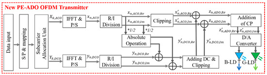 Equation (11) reveals that the frequency domain form of the clipping noise and the absolute value of the output signals of IFFT are a pair of Fourier transforms. Therefore, we can obtain the clipping noise by employing an absolute operation in the time domain rather than an FFT operation, resulting in lower complexity. The obtained time-domain clipping noise can be used as pre-distortion signals, which will be subtracted by the DCO-OFDM branch after the IFFT operation. The diagram of new PEADO-OFDM transmitter with a dual-branch structure is shown in Figure 3.