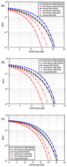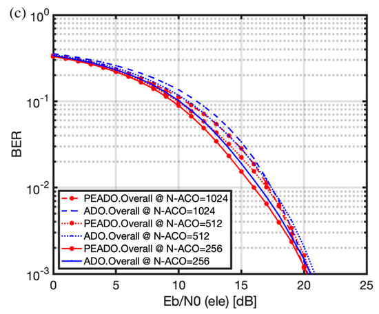 For the ACO-OFDM branch in the PEADO-OFDM and ADO-OFDM schemes, the difference in BER performance becomes obvious when decreases for the reason that the power of PEADO-OFDM signals is lower than ADO-OFDM signals and the difference is increasing with the decrease in . In Figure 5c, the overall BER performances of the PEADO-OFDM and ADO-OFDM schemes with different in the clear water are performed. For any , the PEADO-OFDM scheme has a better overall BER performance than the conventional ADO-OFDM scheme. To obtain an overall BER of 10−3, the PEADO-OFDM scheme achieves about 0.16 dB, 0.29 dB and 0.28 dB gains compared with the enhanced ADO-OFDM scheme when , 512 and 256, correspondingly. For the other UOCM channels, the same analysis can obtain similar results.