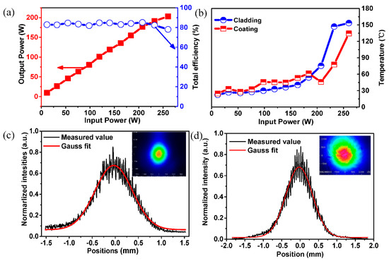 Based on the testing system above, the total efficiency from the fiber source to the output end is tested and the result is shown in Figure 5a. As the power increases, the heat accumulation of the lenses affects the efficiency, so a manual adjustment is needed to make sure the coupling efficiency is at the maximum as the power increases. After the adjustment, the efficiency stays at around 80% when the input power increases under 200 W. The total loss comes from the lenses, the reflectors, the coupling efficiency, the Fresnel reflection and the HCF itself. For the lenses, the transmission is 97.5% and the reflectivity of the reflectors is 99.5%. The transmission loss of the 1-meter-long HCF is 0.12 dB. Additionally, the Fresnel reflection is around 3.9%. According to the loss above, the coupling efficiency is estimated as 88.8%, which dominates the main loss. The output power and the monitored temperature as the input power increased is also shown. The total incident power is 260 W and the output power is 203 W. Figure 5b shows the temperature of the cladding and the coating— it is relatively moderate when the input power is below 200 W. As the input power increases above 200 W, the temperature has a sharp rise which is due to the efficiency starting to decease corresponding to the drop of the efficiency in Figure 5a. In Figure 5b, there are also two drop points in the temperature of the coating, which also correspond to the rising point in Figure 5a, which are the results of manual adjustment of the coupling efficiency. The intensity distribution in Figure 5c,d is consistent with the Gaussian distribution, which means the main energy is still the fundamental mode, and the beam profile is shown in the inset picture of Figure 5c. The beam profile varies between Figure 5c,d as the input power increases to 200 W power level. In the beam profiles, the beam from the fiber source is shown. Comparing the profiles, the edge of the beam from the end cap is not as good as that of the pump source, thus the collapse of air holes of the negative curvature of the HCF when splicing with the end cap has a slight influence on the beam quality of the output light, but the main energy is still concentrated on the center of the beam.