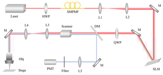 The schematic diagram of system light path. HWP, half-wave plate; SMPMF, single-mode polarization maintaining fiber; M, mirror; SLM, spatial light modulator; QWP, quarter-wave plate; DM, dichroic mirror; Obj, objective lens; Stage, motorized precision translation stage; PMT, photomultiplier tube; L1-L5, lenses. Please see the supporting information for the photograph of the experimental setup.