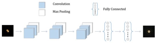 The structure of the convolutional neural network (CNN) is shown in Figure 2. The CNN starts with 3 parts, and each part contains two convolutional layers and a max pooling layer. The convolutional filters have 32, 64 and 128 kernels for each part, and the size of all convolution kernels is 3 × 3, which is used to extract image features. Each of the convolutional layers links an activation function named the rectified linear unit (ReLU), which causes the sparsity of the network and reduces the possibility of overfitting. The essence of pooling is sampling, which can be regarded as a special convolution process, and max pooling with a size of 2 × 2 can remove the maximum value in pooling size, which can effectively reduce the image feature parameters and perform dimensionality reduction. The dropout operation randomly discards some neurons with a probability of 0.3 to avoid overfitting. The last two fully connected layers can integrate the extracted features, run nonlinear transformations and output the predicted wavefront distortion Zernike coefficients for reconstruction.