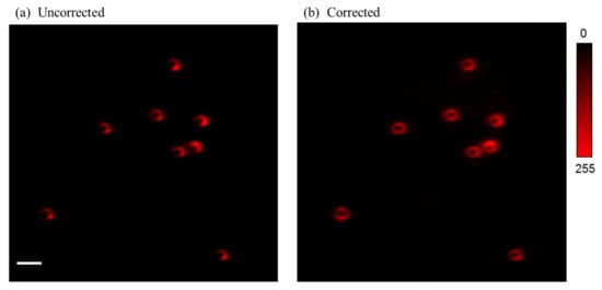 Due to the aberrations of the optical system and the sample, the doughnut-shaped beam cannot be focused on in the ideal state. First, we used aberration correction of adaptive optics based on a convolutional neural network to correct the aberrations introduced by the system. To verify the correction effect, we made gold nanoparticles as a sample. The steps were as follows: drop an appropriate amount of gold nanoparticle solution (200 nm in diameter, Fisher Scientific, Vantaa, Finland) to a coverslip, and encapsulate the coverslip on a microscope slide with mounting medium (97% 2,2′-thiodiethanol, TDE, Fisher Scientific, Vantaa, Finland). We compared the backscattering intensity PSFs of the gold nanoparticles before and after the aberration correction. It can be clearly found that the symmetry of the doughnut-shaped beam intensity distribution was improved after the aberration correction (Figure 3).