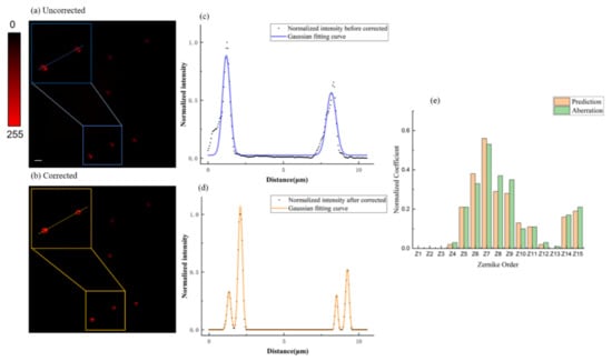 Then, we used random phase patterns with aberrations to examine the effectiveness of the convolutional neural network. Figure 4a,b shows the comparison before and after correction. Even if random and complicated aberrations have been added, our method still demonstrates its effectiveness. Moreover, both the image symmetry and strength in the corrected PSF had a significant improvement compared to those in the uncorrected PSF, which can be observed from the normalized intensity profiles along the lines in Figure 4c,d. The initial and predicted wavefront Zernike coefficients of the first 15 orders (ignoring the first to third) are shown in Figure 4e. We find that the predicted result is extremely close to the actual value, which further shows that our algorithm can effectively perform aberration correction.