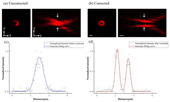 Furthermore, we prepared an agarose sample for the simulation of biological tissues. The sample was prepared according to published protocols [8]. We imaged the 3D PSFs of 200 nm gold nanoparticles before and after the correction. As shown in Figure 5, the PSF improved well and were restored to a doughnut-shape after the correction. The intensity distribution symmetry of the doughnut-shaped beam was improved in the y–z plane after performing the correction.
