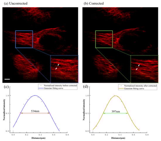 To further demonstrate the capability of machine learning in correcting aberrations in biological samples, we used a method to observe the structures of microtubules in HeLa cells labeled with Alexa Fluor 488 (Abcam, ab150077). The scattering signal of the gold nanoparticles in HeLa cells was used as a guide for the convolutional neural network. Figure 6a,b shows images of tubulin structures in the HeLa cells labeled with Alexa Fluor 488. It can be clearly found that the resolution of the image has been restored after the aberration correction. By fitting the intensity profiles along the white arrows in the magnified images with a Gaussian function, two full-widths at half-maximum (FWHMs) can be obtained, 534 nm in the uncorrected image and 397 nm in the corrected image, and the resolution increased about 20%. Similarly, the intensity of the image is also improved after aberration correction, as shown in Figure 6c,d. It should be noted that due to the difference in the internal structure of biological cells, the refractive index distribution is uneven, and the aberrations in different regions are also different. To further improve the calibration effect, the sample can be calibrated by region. The more regions the sample is divided into, the better the calibration effect is. However, because the aberration of our sample itself is limited, only one calibration point can meet the demand.