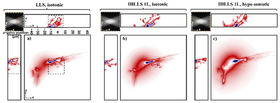 Tomographic imaging of a lamprey spinal cord ventral horn neuron with dendrites, xy FOV 208 × 208 µm2, 2048 × 2048 pixels, yz, (xz) FOV 208 × 40 µm2, 2048 × 400 pixels, in a conventional LLS (a) and incoherent LLS with only one diffractive lens (IHLLS 1L) of focal length 400 mm without deconvolution; recordings were initially in isotonic solution (b), and then in hypotonic solution to cause swelling (c). On the sides and above are shown the max projections through the volume (400 z-galvo steps). The Bessel beams are displayed in the upper-left corner of each xy-projection to show the orientation of the beams (FOV 208 µm2). The area enclosed inside the colored dashed rectangles are as follows: black—the scanning area for the original LLS (52 µm2), and yellow—the actual scanning area for the LLS, IHLLS 1L, and IHLLS 2L.