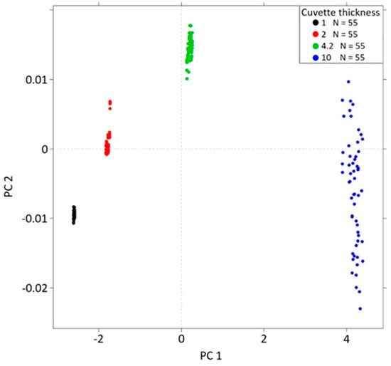 The light passes through the glass located at the bottom of the cuvette, through the sample, is reflected from the white surface of the reflector, and returns back to the receiver. The thickness of the cuvette can be changed by using reflectors with different heights. The cuvette thickness was chosen based on the results of a previous experiment [], where we measured the spectra of samples using a cuvette with changeable thickness. The path length has a strong influence on the absorption, and the groups of measured spectra with different path lengths are far from each other on the principal component analysis scatterplot (Figure 2). The longest path length shows the biggest variance due to poor repeatability []. The results with 4.2 mm cuvette thickness provided good repeatability together with sufficiently high values of useful signals.