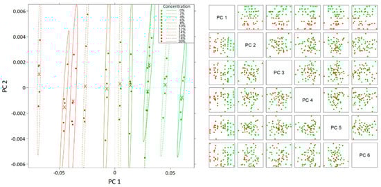 Principal component analysis scatterplot of aqueous samples with different NaCl concentration calculated from measured visible spectral characteristics (420–730 nm) using 4.2 mm cuvette thickness (8.4 mm technical path length). Left, first two principal components; right, higher dimensions.