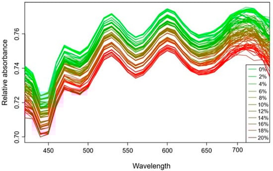 The absorbance spectra of the tested aqueous solution of NaCl for the 420–730 nm spectral range are presented in Figure 4. Spectra are colored according to concentration, where a concentration of 0% is pure Milli-Q water. It can be observed that the changes in salt concentration give baseline shifts and wavelength-dependent variations.