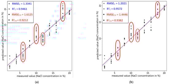 PLSR models used for predicting NaCl concentration using all measured spectra and after removing the outliers are presented in Figure 5.