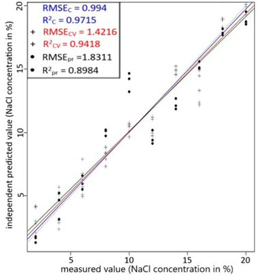 Cross-validation results of the models are presented in Table 2. The coefficient of determination (R2) represents the accuracy of the model, and root-mean-square error of cross-validation (RMSECV) shows the precision of the cross-validation (minimal step in NaCl concentration, which can be accurately predicted by the model).
