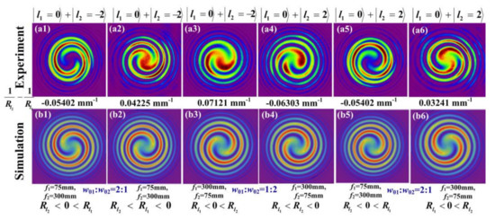 Interferograms of a focused TEM00 Gaussian beam and a focused vortex beam () with different wavefront curvature radii; (a1–a6) the experimentally measured spiral pattern; (b1–b6) the numerical simulations.