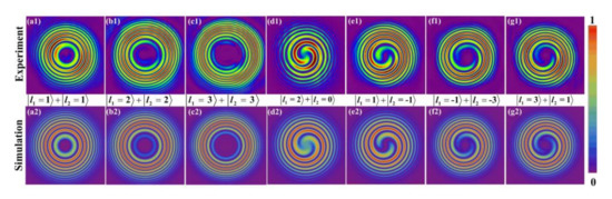 Comparing different images shown above, we can draw the following conclusions: (i) The spiral lobes N equals to the module of the TCs’ difference (); (ii) The twist direction (clockwise or counterclockwise) depends on both the sign of and , clockwise for the same sign, and vice versa. (iii) The spiral pattern disappears and becomes to concentric rings, when the TCs of two interference beams are the same.