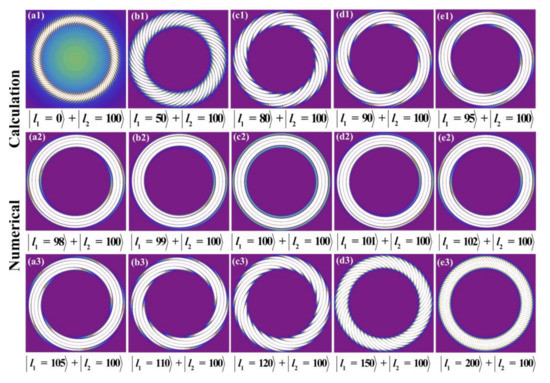 Interference pattern formed by coaxial interference between two vortex beams carrying a large number of TCs is also studied numerically. Due to lack of SPPs with TCs of large value, we did not perform the experiment in this part. During the calculations below, we suppose both beams have a waist at z = 0, and choose w1 = 1 mm, and w2 = 0.8 mm, respectively. The interference pattern is detected at the position where two interference beams have the same beam spots at z > 0, thus resulting in . During the simulations, l2 is kept fixed at 100, and l1 is changed from 0 to 200. As shown in Figure 7, the spiral lobe number is equal to , the twist direction is clockwise for , and counterclockwise for . Although the TCs of vortex beam is as high as 100, the conclusions mentioned above still hold. The interference pattern for coaxial superposition between a Gaussian beam and a vortex beam with large value TCs is shown in Figure 7a1, the interference fringes show exactly 100 clockwise spiral fringes from the singularity. The spiral lobes are so dense that it is difficult to count them clearly. It also shows that the traditional method of coaxial interference between a Gaussian beam and a vortex beam is not suitable for measuring the large value TCs carried by the vortex beam. As shown in Figure 7a2–e2), the spiral pattern will be clear to distinguish, if the TCs of the two vortex beams are close to each other. These results indicate that the vortex beam of unknown TCs can be detected by coaxial interfering it with a reference vortex beam of known TCs.