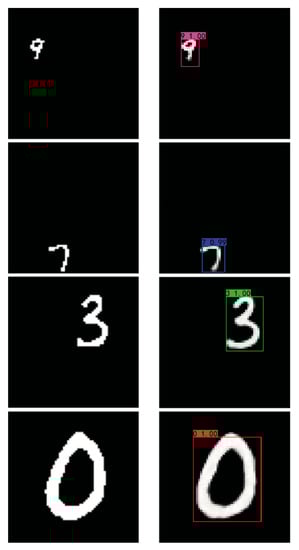 Each S-vector is associated with a three-part label consisting of the original image (used to train the imaging task), location coordinates (used to train the location task), and the image category (used to train the classification task). We developed a labeling program. Each picture in the MNIST dataset contains an image of only one number, so we obtained the bounding box of the single number in the original image by scanning the pixels one by one from the outside to the inside. The bounding box of the single number was mapped onto a bounding box in the final picture, according to the ratio in the resize operation and the number’s location in the final image. The label of the number (in the original dataset) was also used to construct the ground-truth of the final picture.