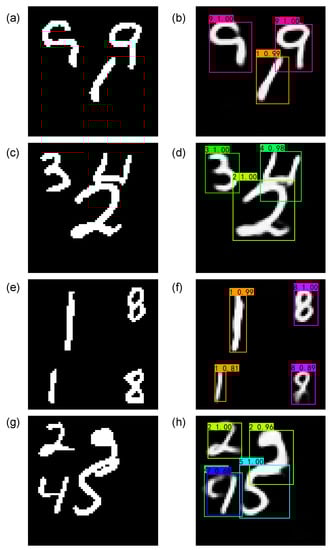 Therefore, we designed the test set with 40 differently-sized MNIST test samples that contained only a single object to provide some degree of comparison (four examples are shown in Figure 2). When using a single-object test set, at a sampling rate of 8.1% (sampling rate is calculated by M/N = 333/4096), for 40 single target pictures, SP-ILC predicted 43 bounding boxes, of which 40 were correct. The precision of this performance was 0.930 (40/43). A total of 43 bounding boxes mean that SP-ILC may give more than one prediction for one object, for example, in Figure 4h, the number ‘4’ has been given two predictions, which will decrease the precision of the system. The recall was 1.000 (40/40). This classification performance matches that of current state-of-the-art classification tasks [34,37]. We note that in previous studies of the single-pixel classification there is prior knowledge that a scene contains only one object. SP-ILC does not have such prior knowledge, so even for a single object scene, our task is more difficult than current classification algorithms. Moreover, other studies have used similar-sized objects, whereas the object size in our test set varies.
