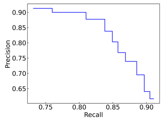 We examined the precision–recall curves in terms of accuracy of object location and accuracy of classification. The PR curve in Figure 5 shows changes in precision and recall for the object location and classification tasks in response to changes in the confidence level during testing; it is a good measure of network performance.